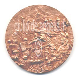 Nell'anno (2001) in cui cade il quindicesimo anniversario della costituzione in Roma del Tribunale Militare di Sorveglianza, è stata coniata questa medaglia che nel dritto raffigura la Giustizia e nel rovescio l'evoluzione avvenuta attraverso i secoli del concetto di "attività militare", passando dalla rappresentazione del guerriero come mero aggressore, a quella del soldato come difensore della sua Patria in un'ottica se non egoistica quanto meno strettamente di gruppo, per giungere a quella del militare consapevole della ancora più nobile sua attuale funzione che, pur volta prioritariamente all'adempimento del sacro dovere di difesa della Patria, non tralascia il profondo sentimento di solidarietà verso i deboli e gli oppressi. (F. F.) |